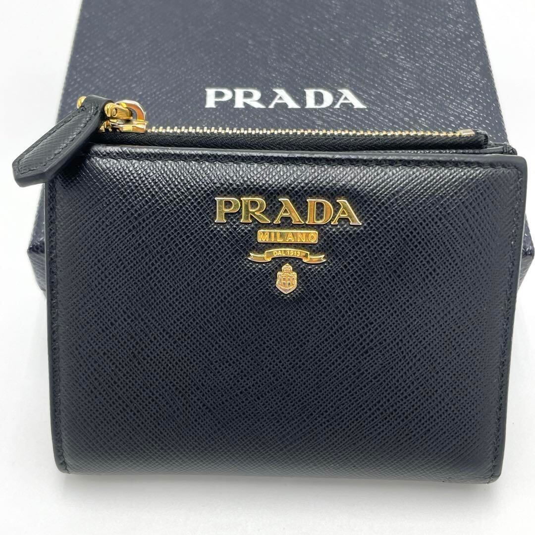 高級感あふれるPRADAの黒い二つ折り財布、ゴールドロゴとファスナー付きで機能的。