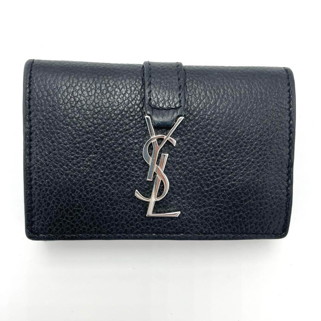 ブラックレザーの三つ折り財布、YSLロゴ付き。