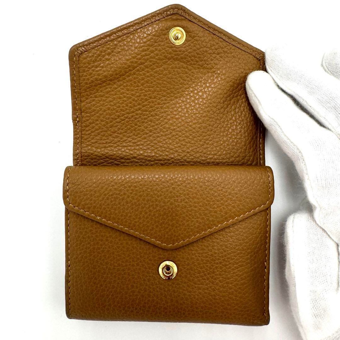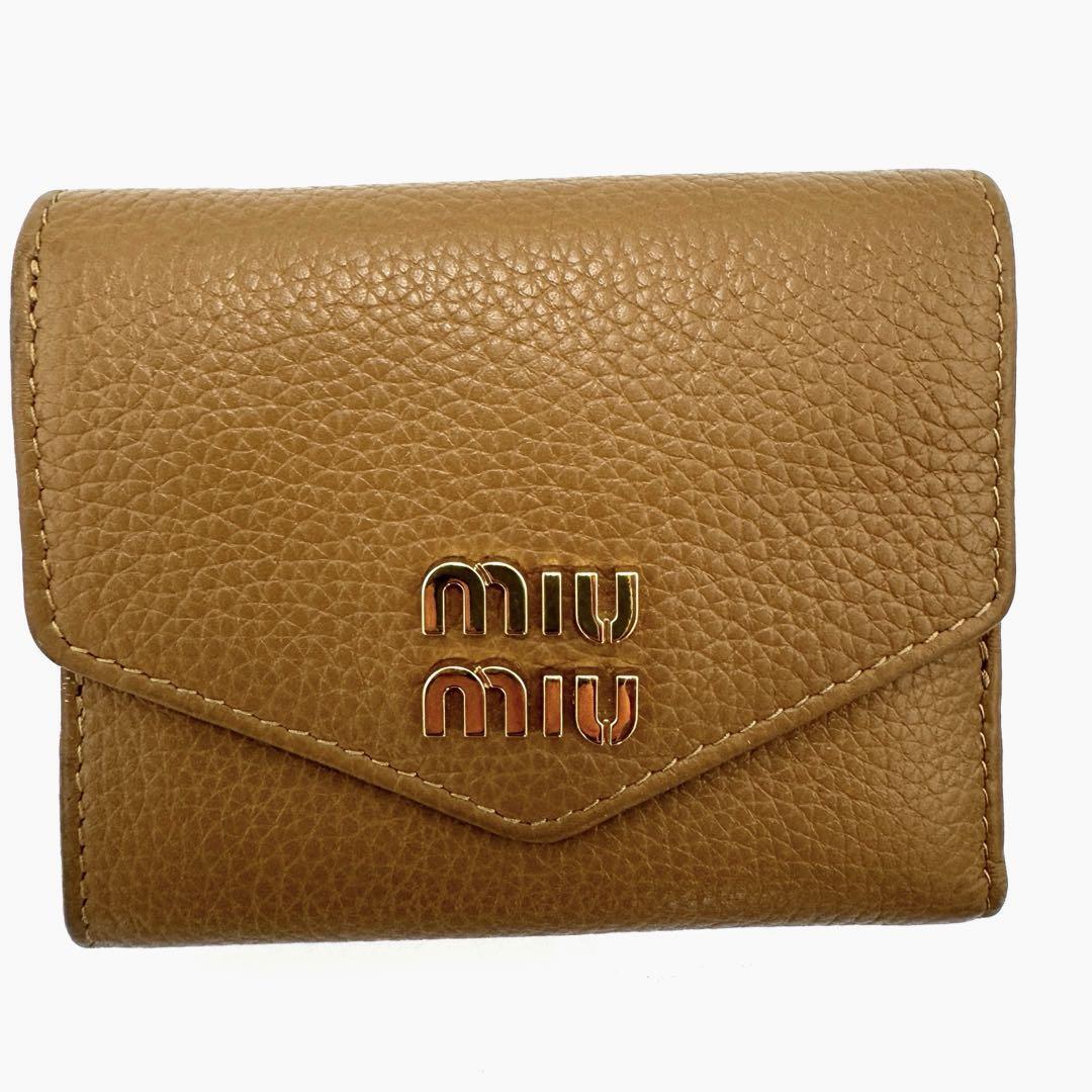 ブラウンレザーのMIU MIU三つ折り財布、コンパクトでスタイリッシュ。