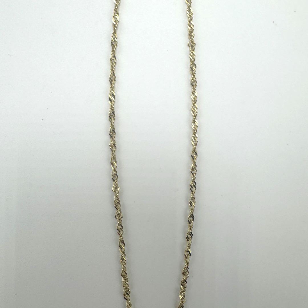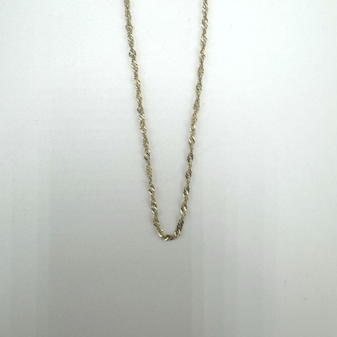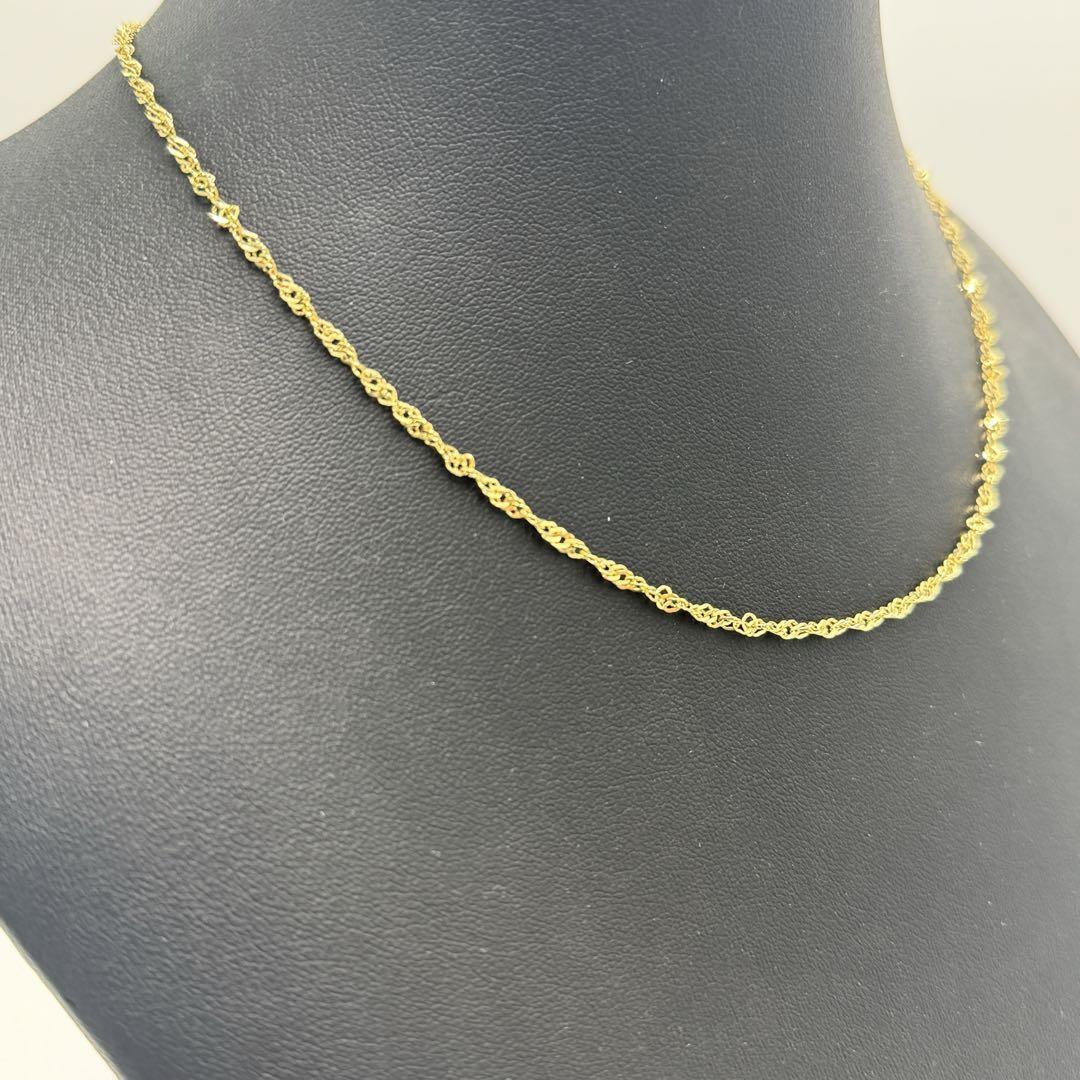 ツイストデザインのゴールドネックレス、金属製で標準的な長さ。