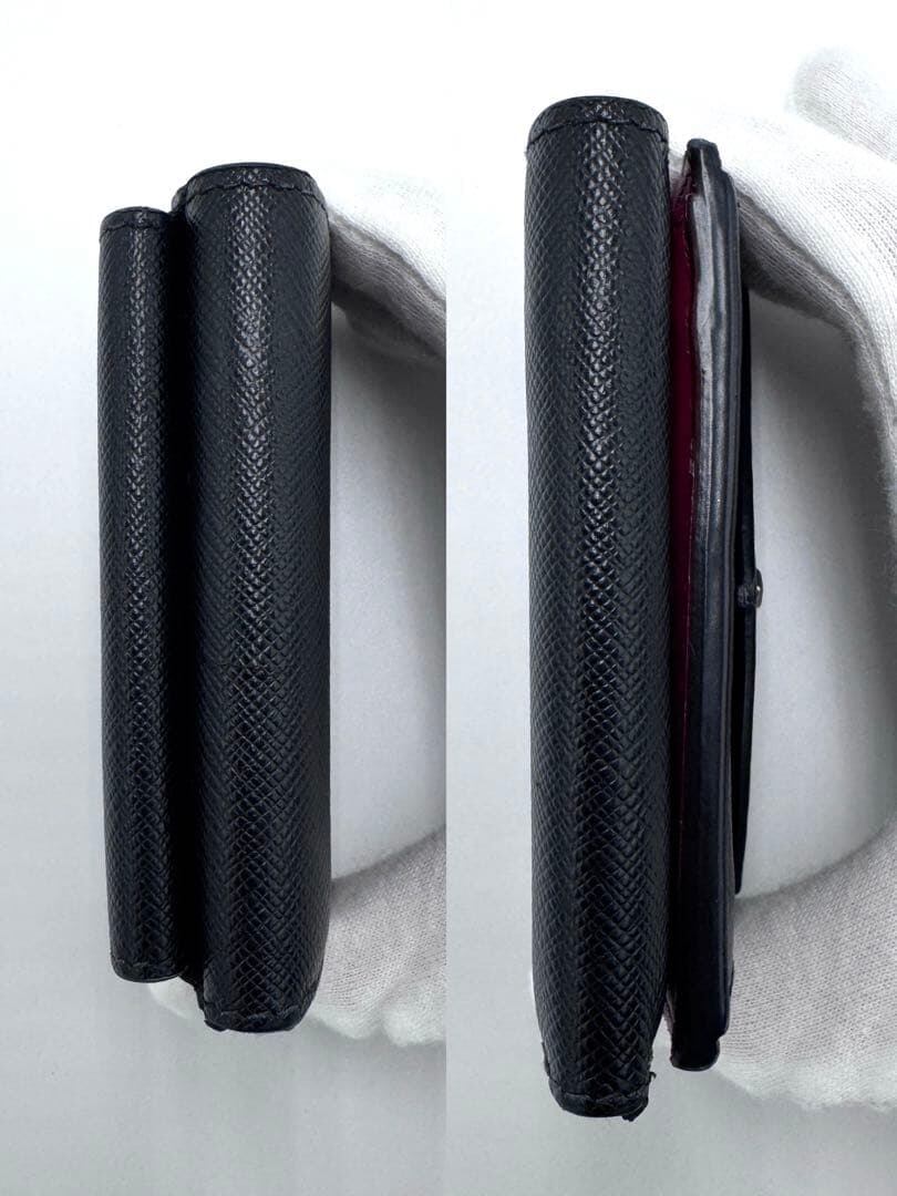 PRADAのブラックレザー三つ折り財布、内装はレッドでスタイリッシュ。