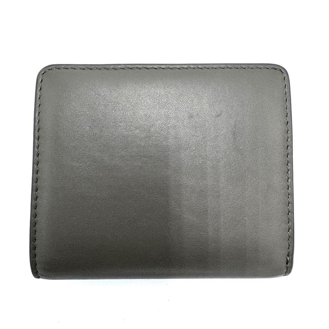 シンプルなデザインのグレーのレザー二つ折り財布、白いステッチが特徴的。