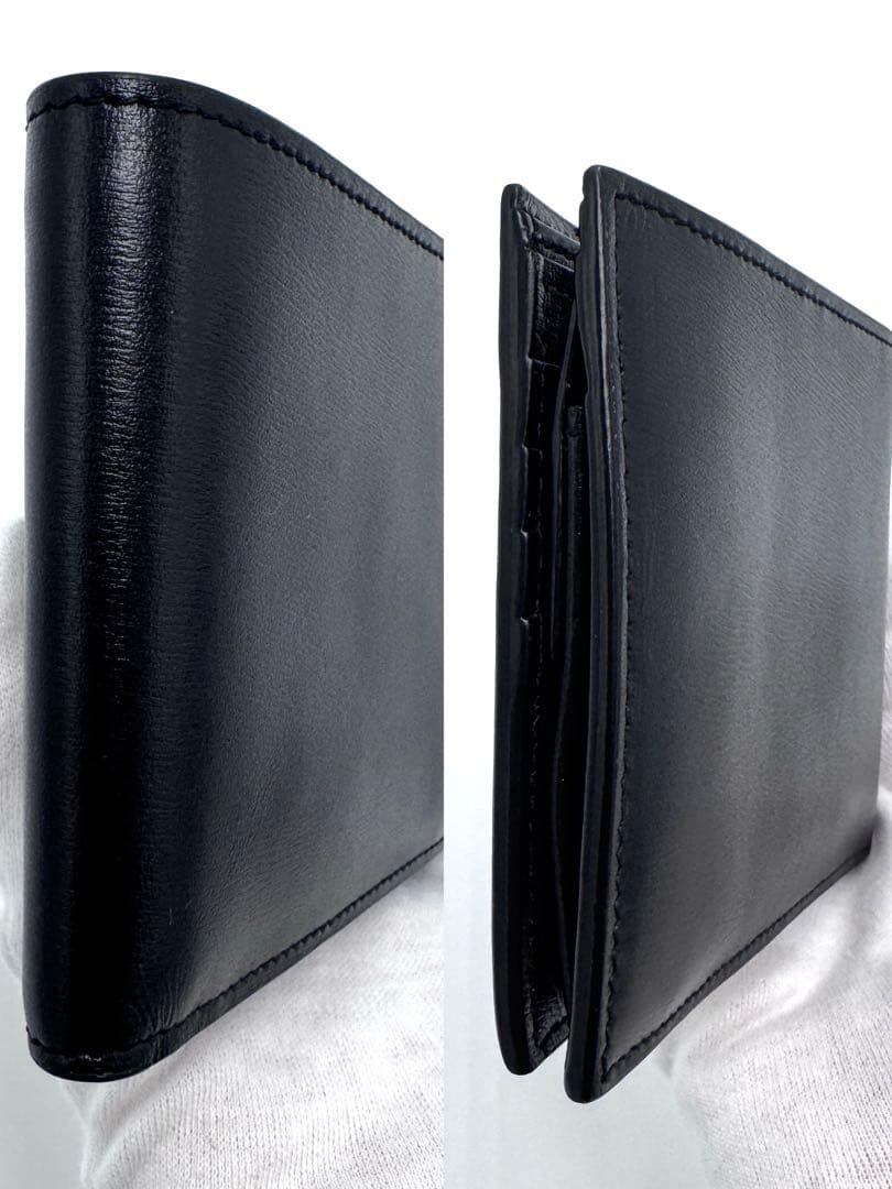 シンプルで洗練されたデザインの黒いレザー二つ折り財布。