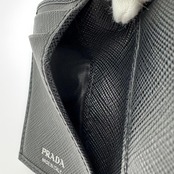 PRADAのブラックレザー三つ折り財布、ロゴプレート付きでスタイリッシュ。