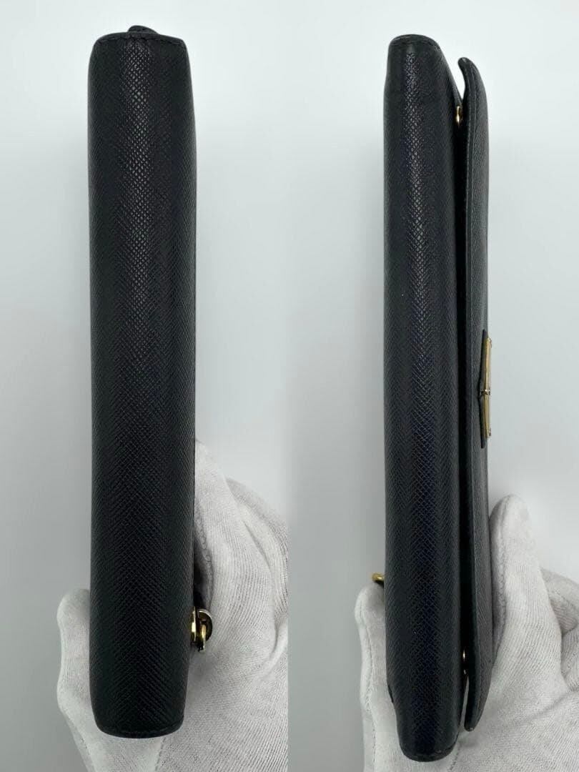 PRADAのサフィアーノレザー製のブラック長財布、ゴールドファスナー付き。