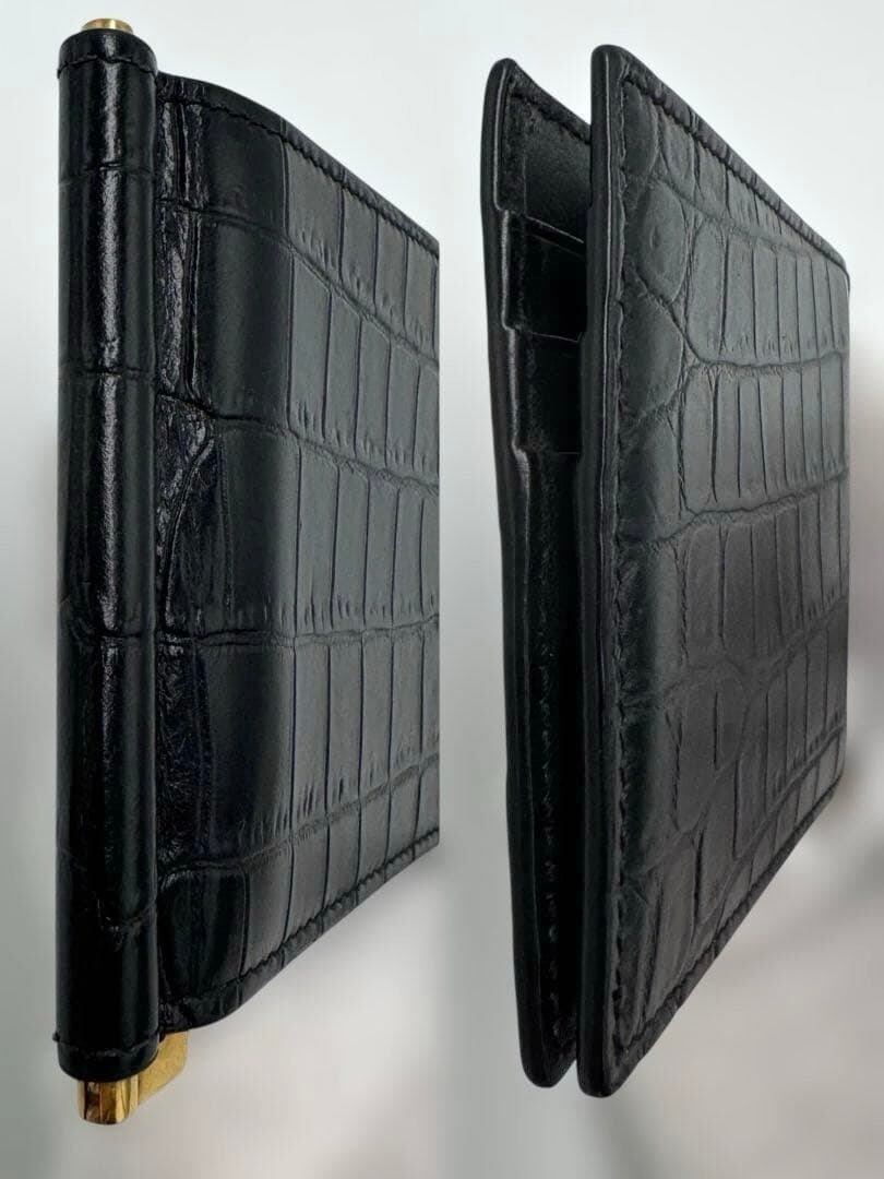 クロコダイルレザー製のブラックマネークリップ、洗練されたデザイン。