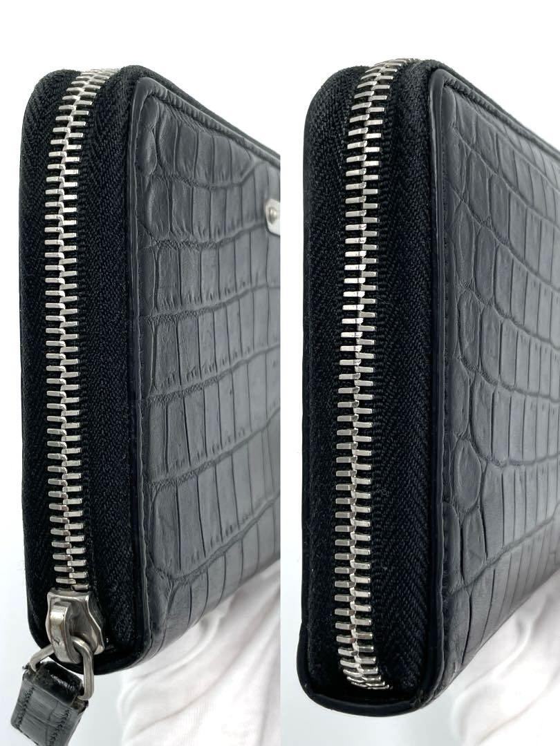 エレガントなブラックのクロコダイル風レザー長財布、ジッパー式で使いやすいデザイン。