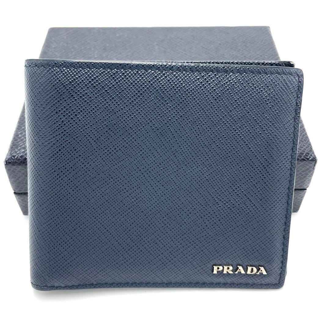 ネイビーのレザー製二つ折り財布、PRADAロゴ付き。