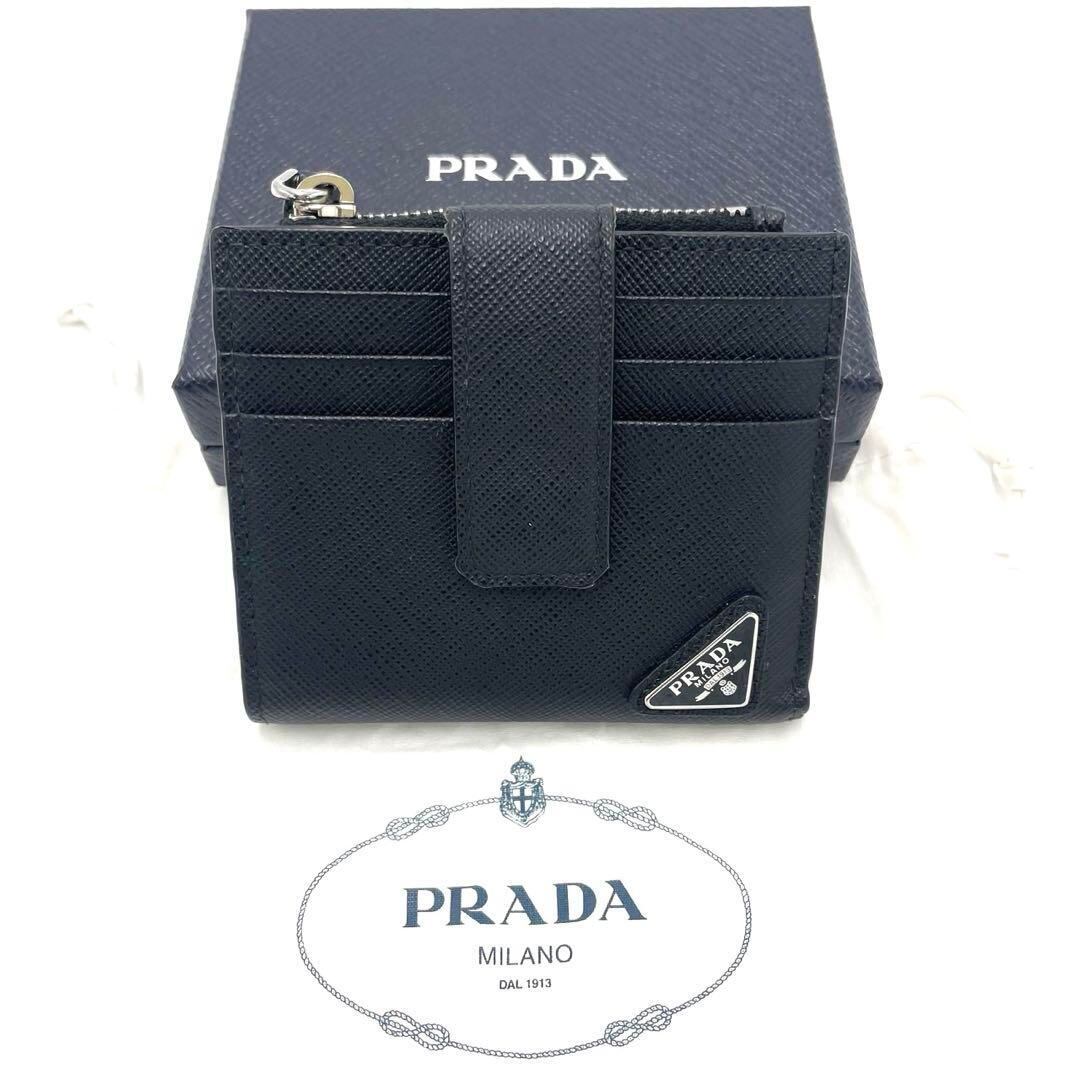 PRADAのサフィアーノレザー製のブラック二つ折り財布。カードポケット4つとファスナー付き小銭入れを備え、機能性とスタイルを兼ね備えています。